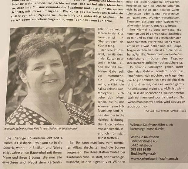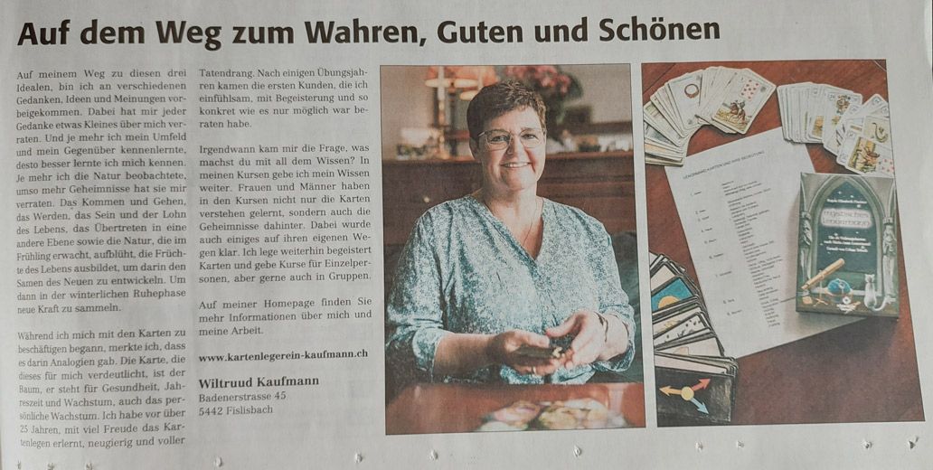 Mein Name ist Wiltruud Kaufmann und ich bin erfahrene mediale kallisophische Kartenlegerin. Sie sind auf der Suche nach Antworten in den Bereichen Liebe, Finanzen und Beruf?